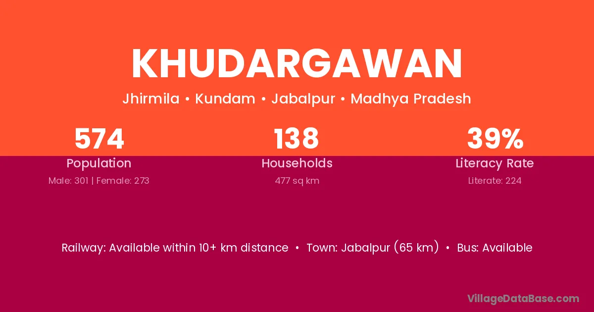 Jabalpur (65 km) is the nearest town to Khudargawan village for major economic activities and is located approximately 65 km away.