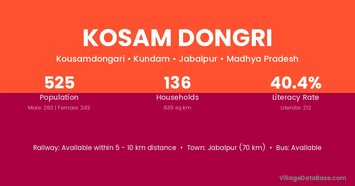 Jabalpur (70 km) is the nearest town to Kosam Dongri village for major economic activities and is located approximately 70 km away.