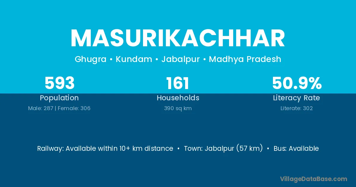 Jabalpur (57 km) is the nearest town to Masurikachhar village for major economic activities and is located approximately 57 km away.