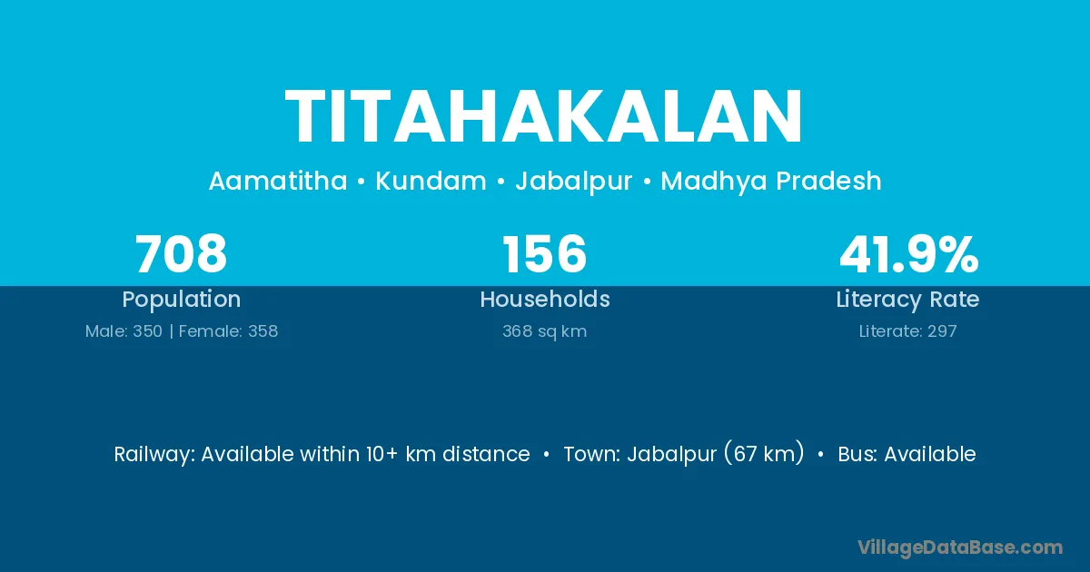 Jabalpur (67 km) is the nearest town to Titahakalan village for major economic activities and is located approximately 67 km away.