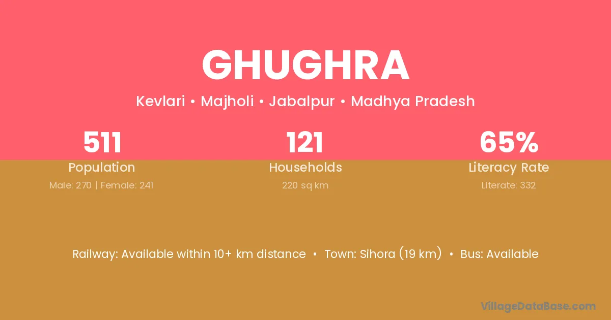 Sihora (19 km) is the nearest town to Ghughra village for major economic activities and is located approximately 19 km away.