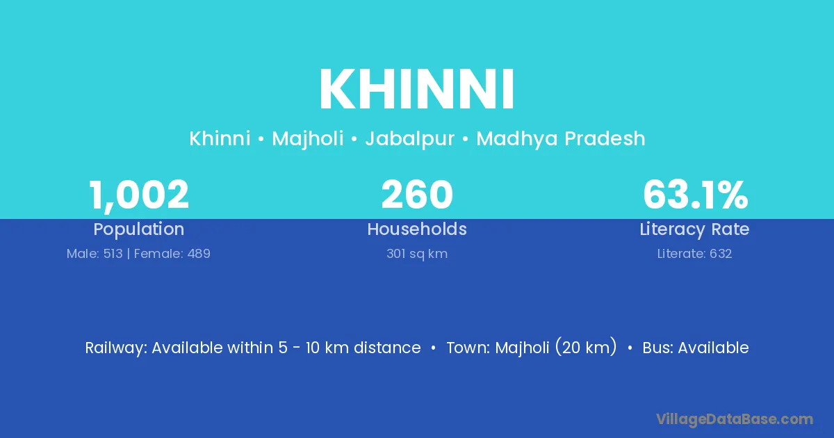 Majholi (20 km) is the nearest town to Khinni village for major economic activities and is located approximately 20 km away.