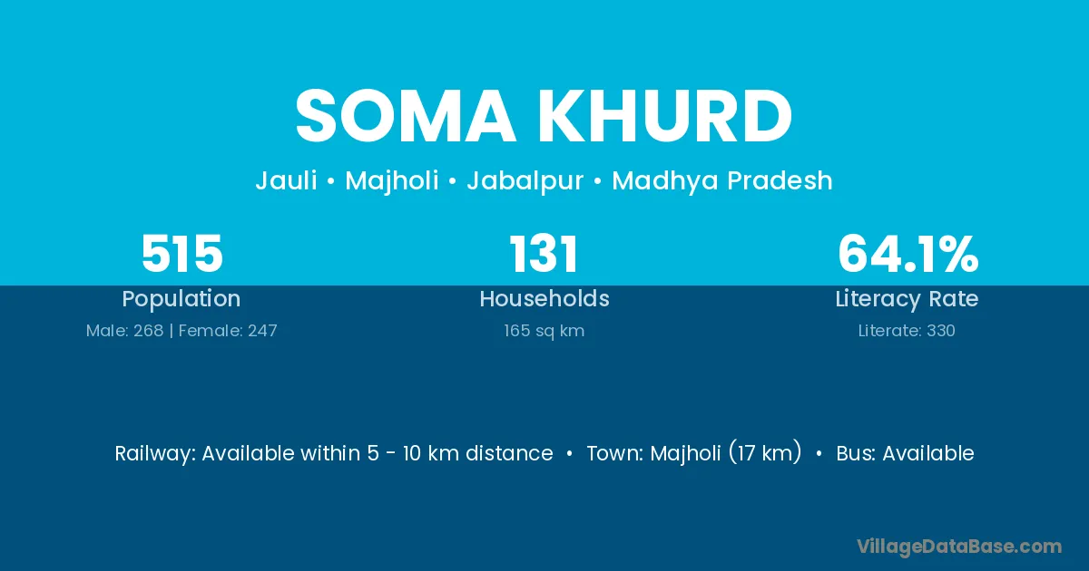Majholi (17 km) is the nearest town to Soma Khurd village for major economic activities and is located approximately 17 km away.