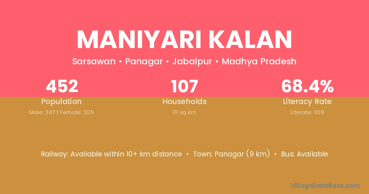 Maniyari Kalan village has a total population of 452 people, of which 247 are males and 205 are females.