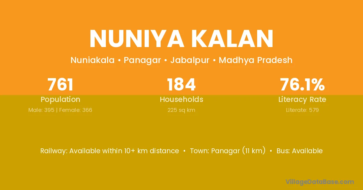 Panagar (11 km) is the nearest town to Nuniya Kalan village for major economic activities and is located approximately 11 km away.