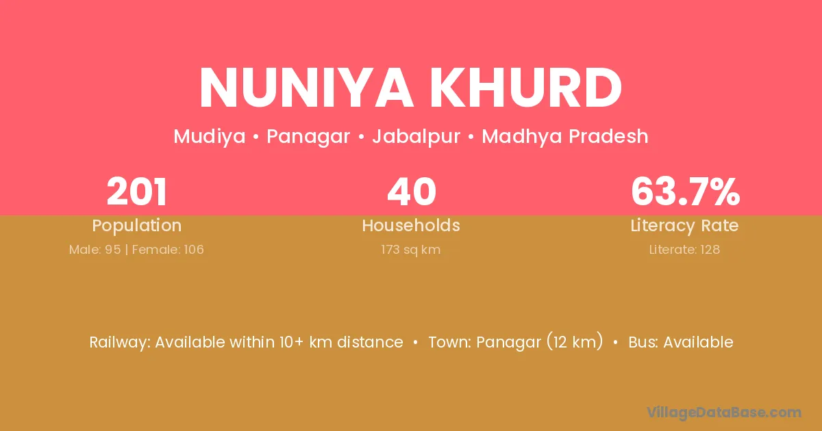 Nuniya Khurd village has a total population of 201 people, of which 95 are males and 106 are females.