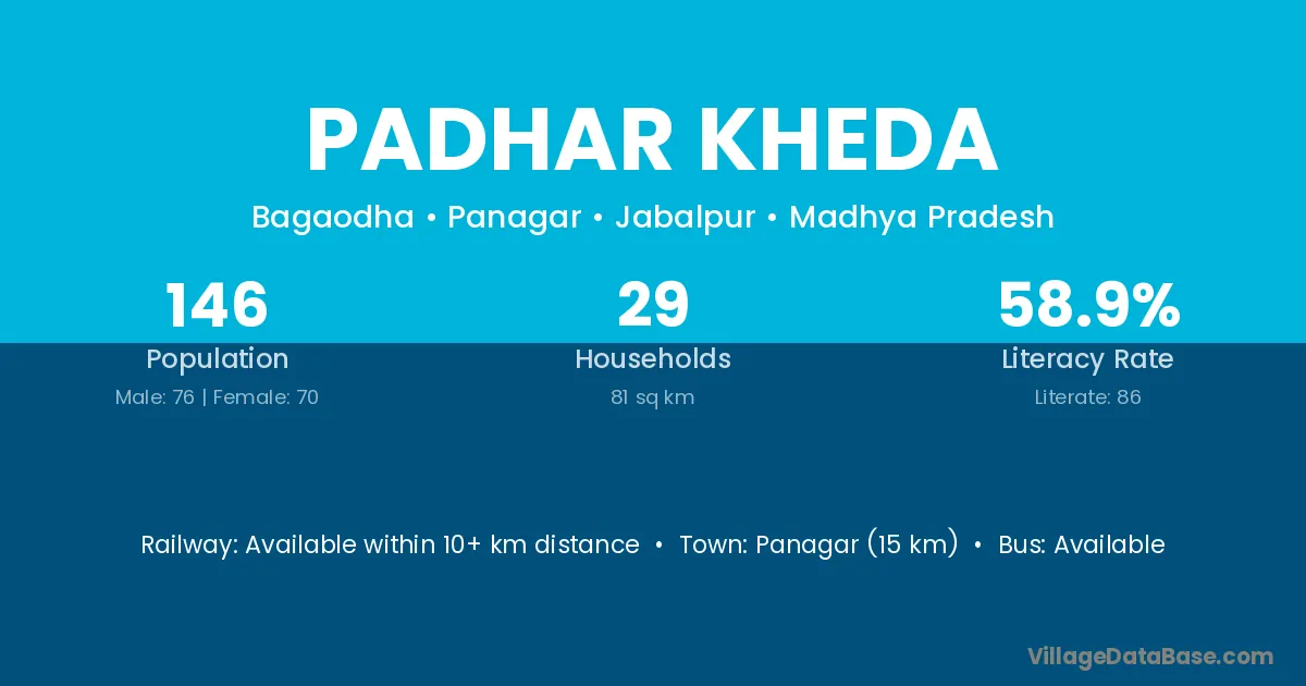 Panagar (15 km) is the nearest town to Padhar Kheda village for major economic activities and is located approximately 15 km away.