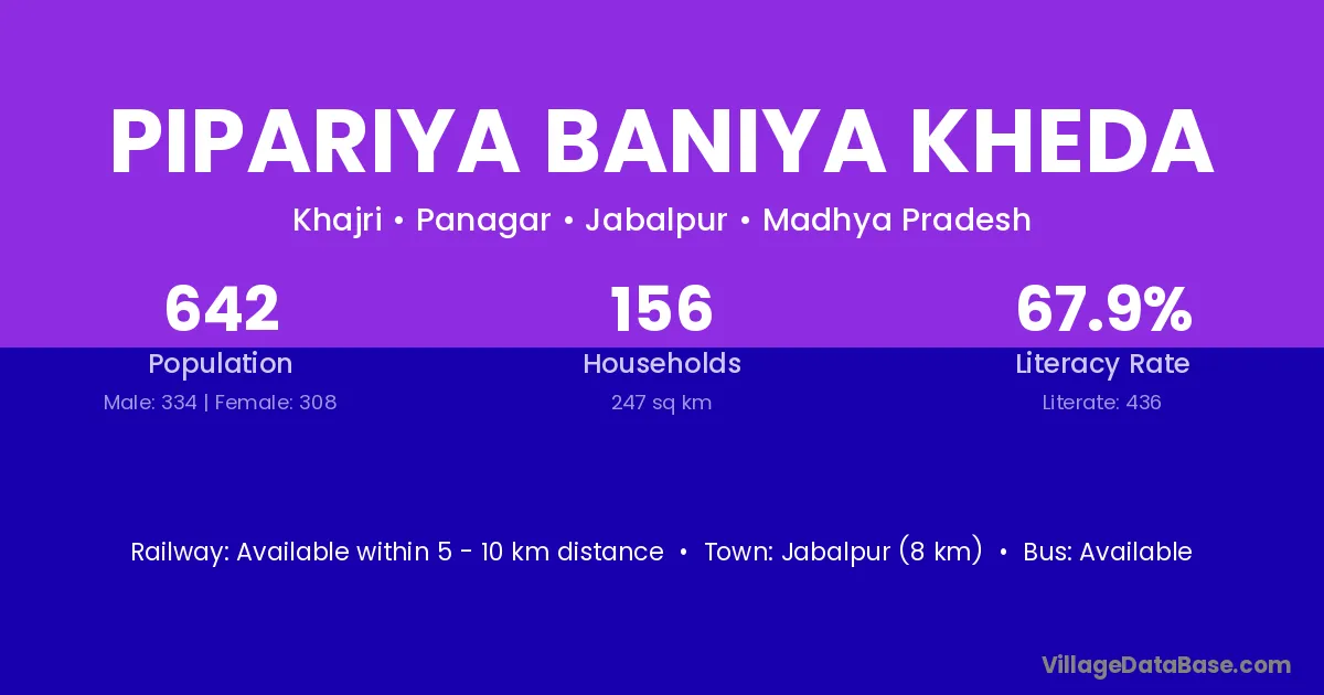 Jabalpur (8 km) is the nearest town to Pipariya Baniya Kheda village for major economic activities and is located approximately 8 km away.