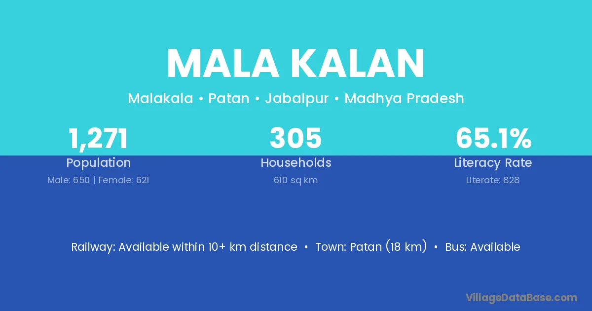 Mala Kalan village has a total population of 1,271 people, of which 650 are males and 621 are females.