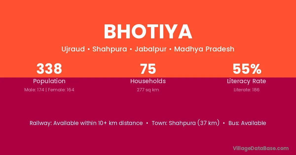 Shahpura (37 km) is the nearest town to Bhotiya village for major economic activities and is located approximately 37 km away.