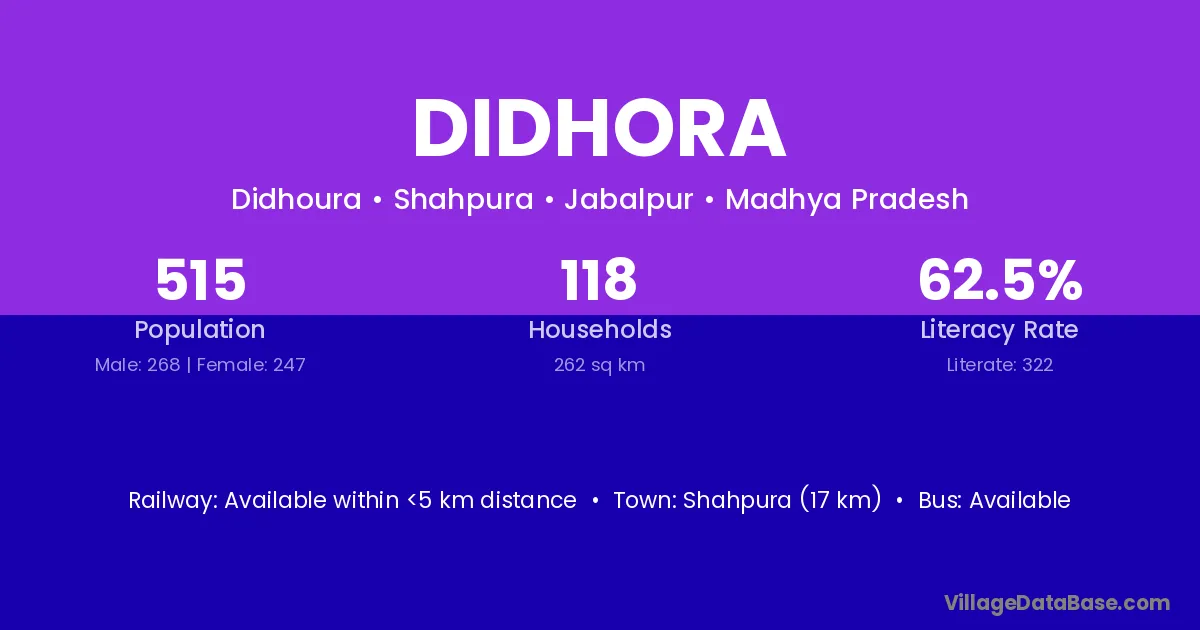 Shahpura (17 km) is the nearest town to Didhora village for major economic activities and is located approximately 17 km away.