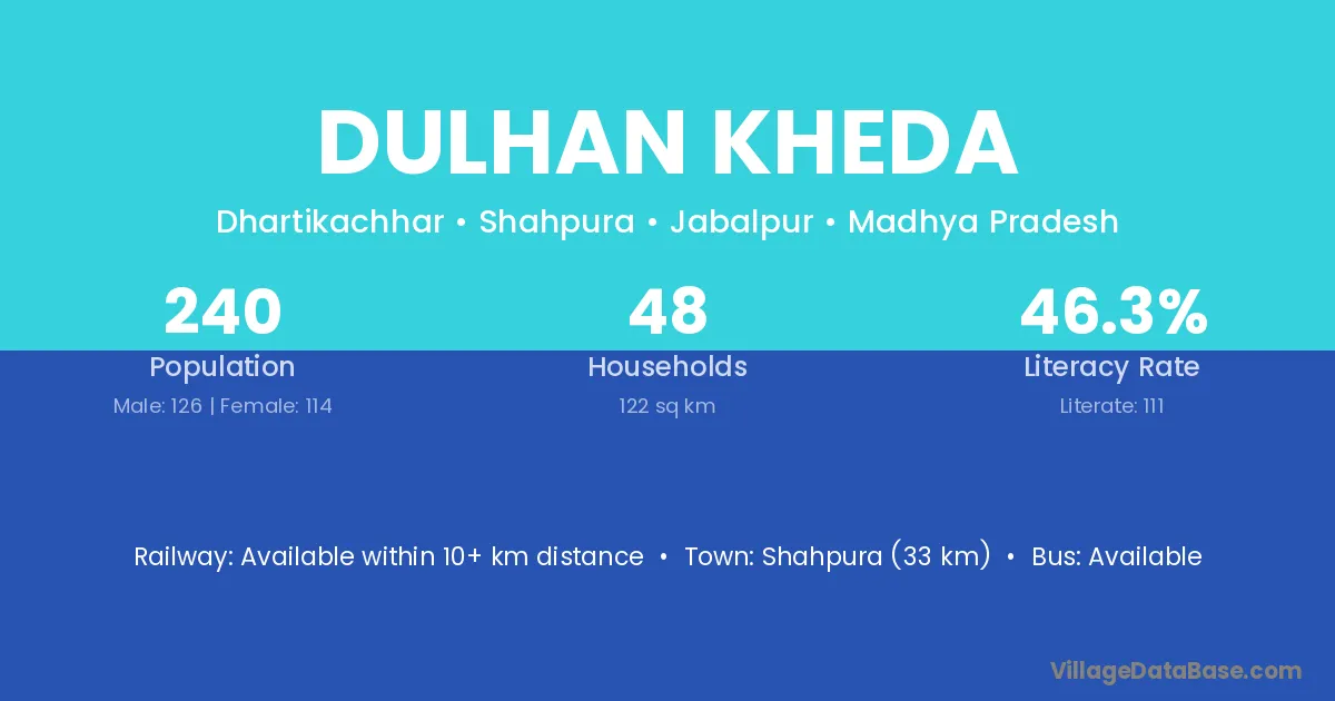 Dulhan Kheda village has a total population of 240 people, of which 126 are males and 114 are females.