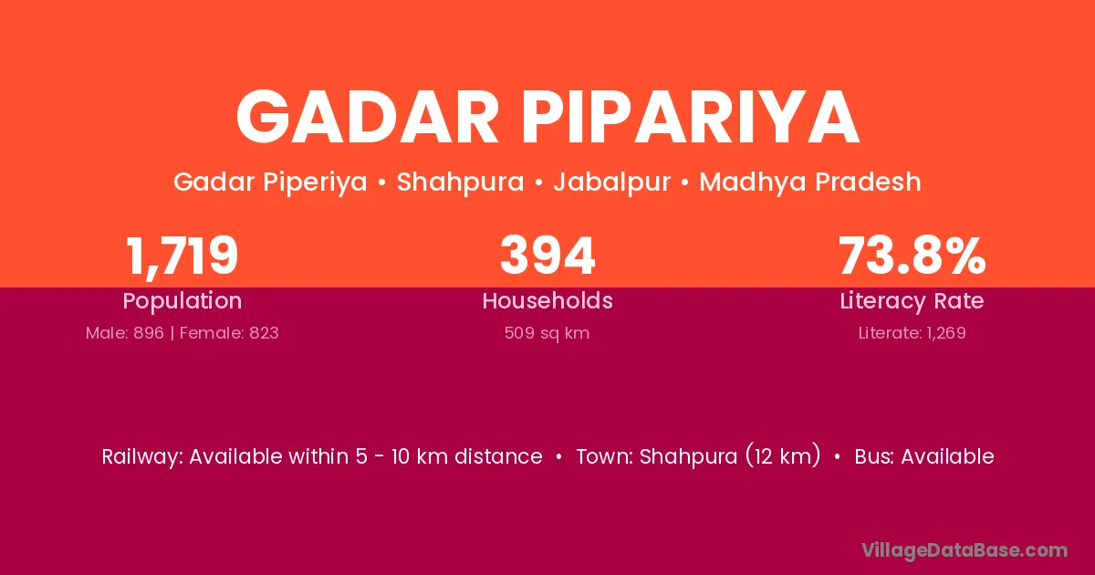 Shahpura (12 km) is the nearest town to Gadar Pipariya village for major economic activities and is located approximately 12 km away.