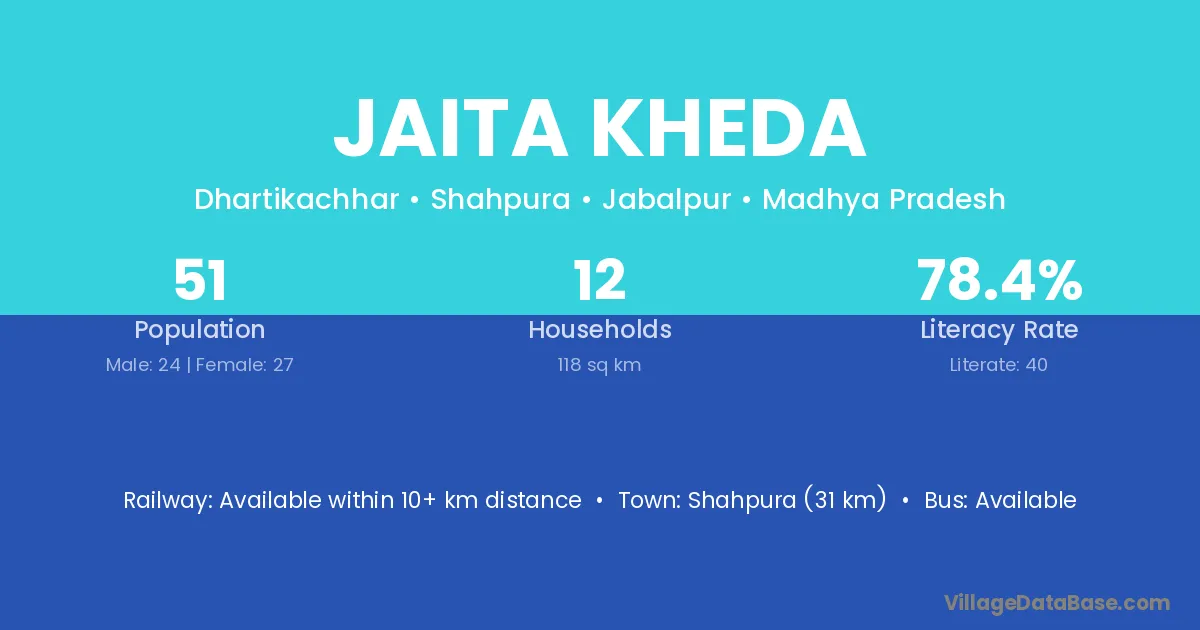 Jaita Kheda village has a total population of 51 people, of which 24 are males and 27 are females.