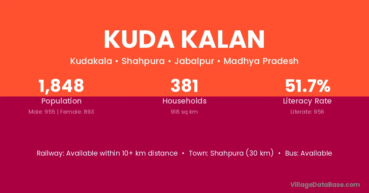 Kuda Kalan village has a total population of 1,848 people, of which 955 are males and 893 are females.