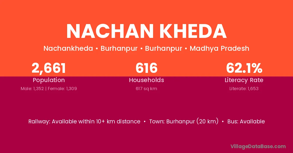 The literacy rate of Nachan Kheda village is 55.86%. Male literacy stands at 64.80% and female literacy at 45.45%.