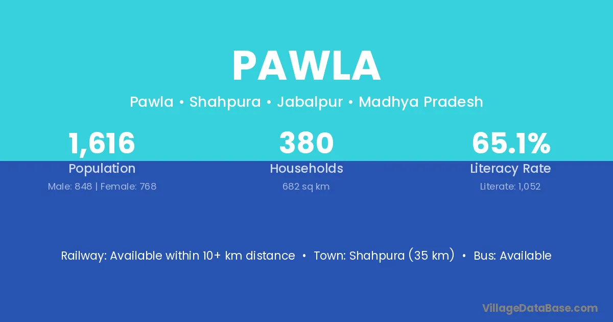 Pawla village has a total population of 1,616 people, of which 848 are males and 768 are females.