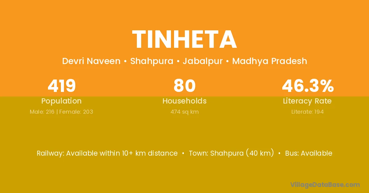 Shahpura (40 km) is the nearest town to Tinheta village for major economic activities and is located approximately 40 km away.