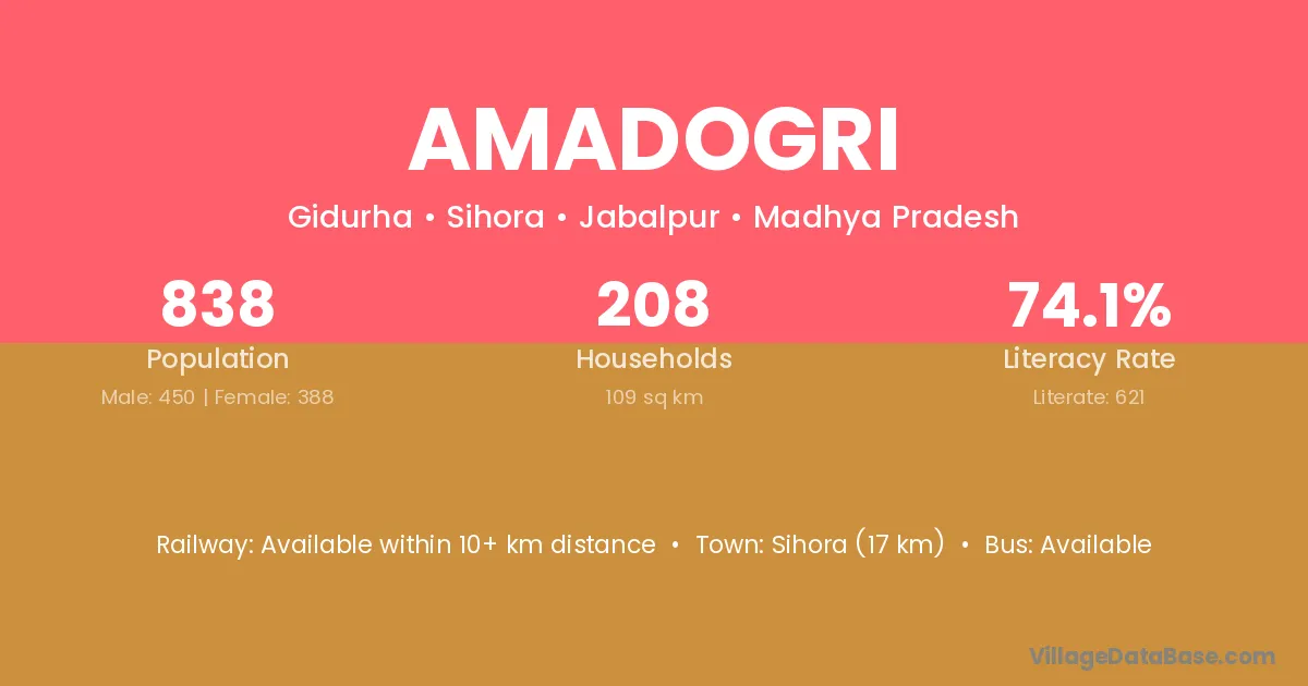 Sihora (17 km) is the nearest town to Amadogri village for major economic activities and is located approximately 17 km away.