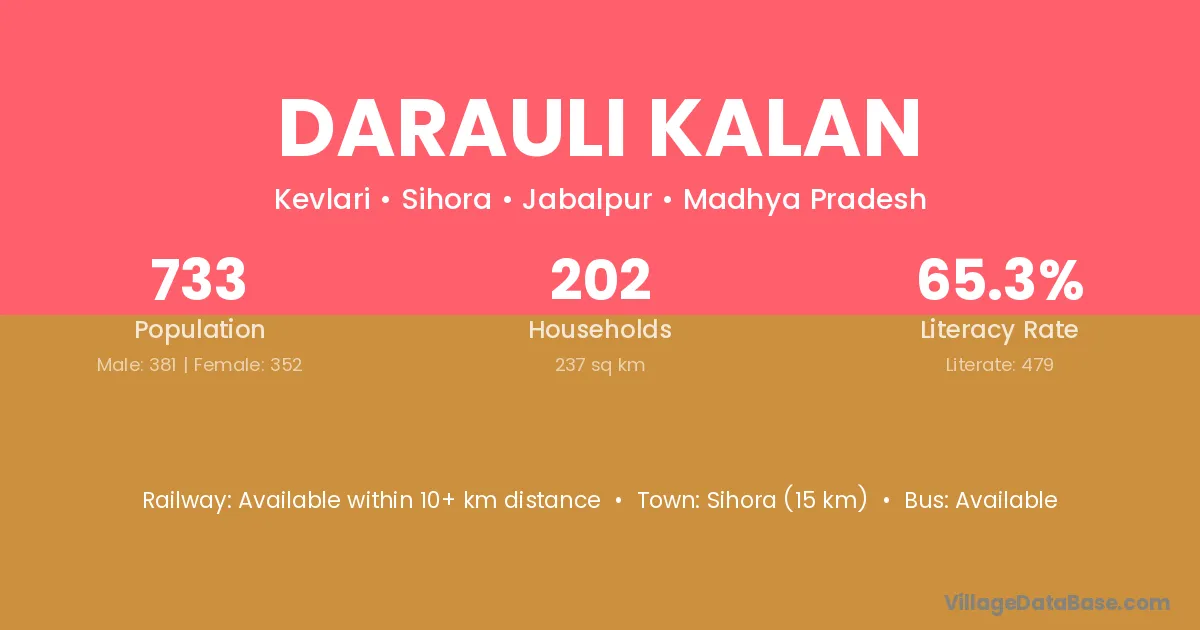 Sihora (15 km) is the nearest town to Darauli Kalan village for major economic activities and is located approximately 15 km away.