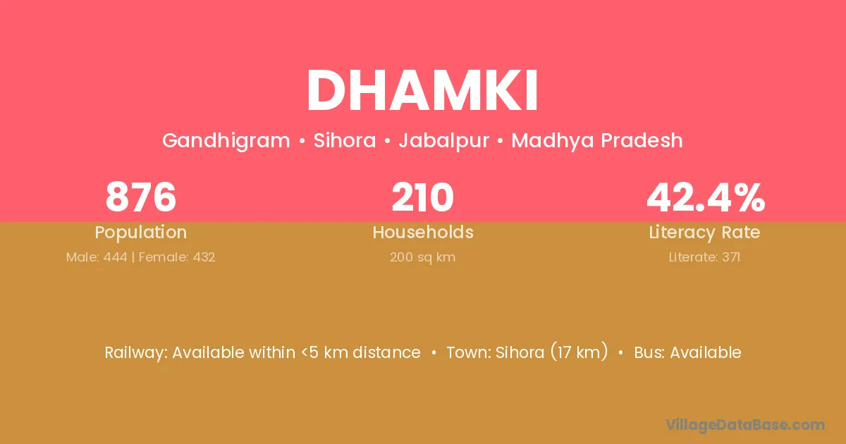 Sihora (17 km) is the nearest town to Dhamki village for major economic activities and is located approximately 17 km away.