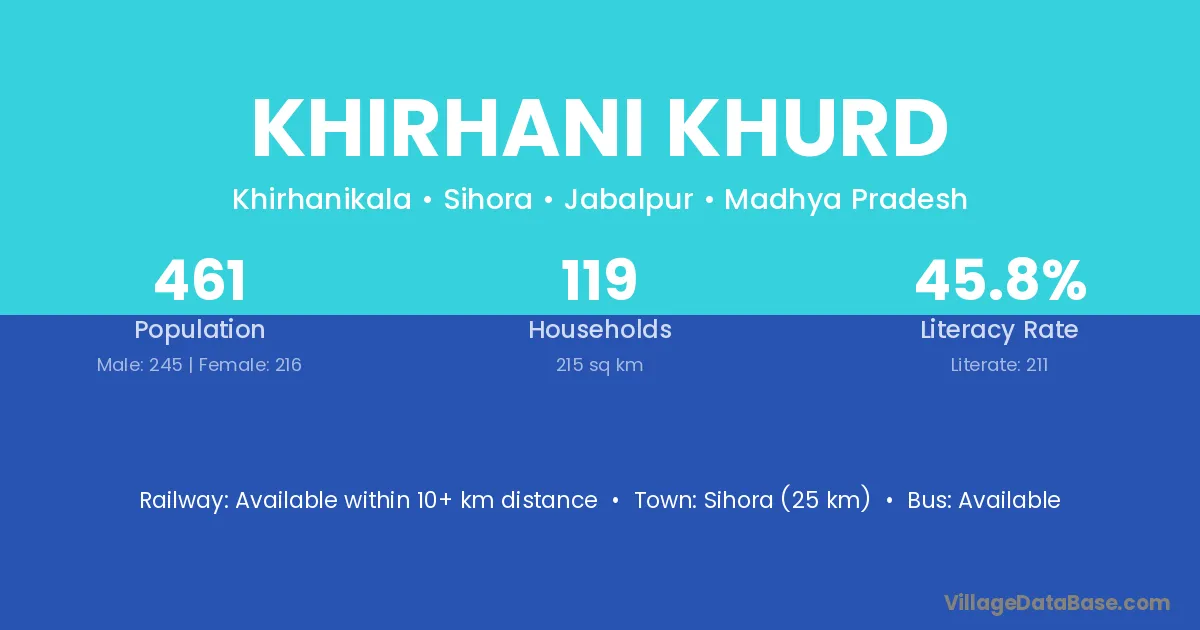 Sihora (25 km) is the nearest town to Khirhani Khurd village for major economic activities and is located approximately 25 km away.