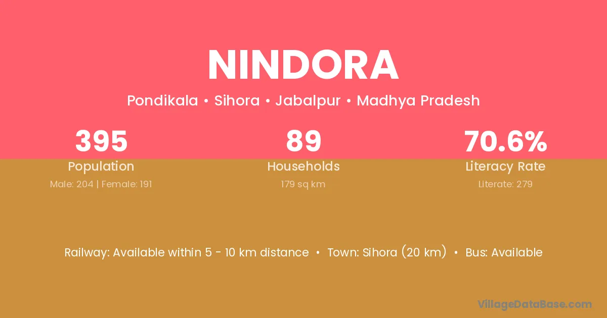 Sihora (20 km) is the nearest town to Nindora village for major economic activities and is located approximately 20 km away.