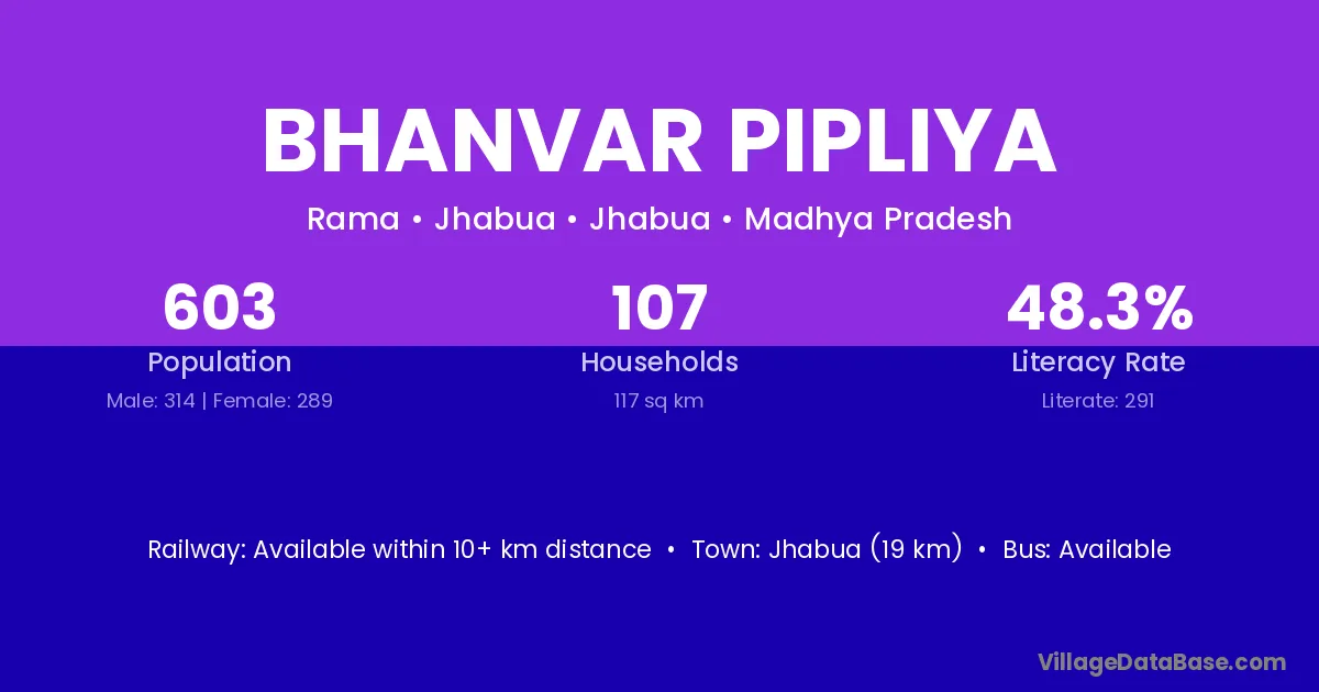 Jhabua (19 km) is the nearest town to Bhanvar Pipliya village for major economic activities and is located approximately 19 km away.