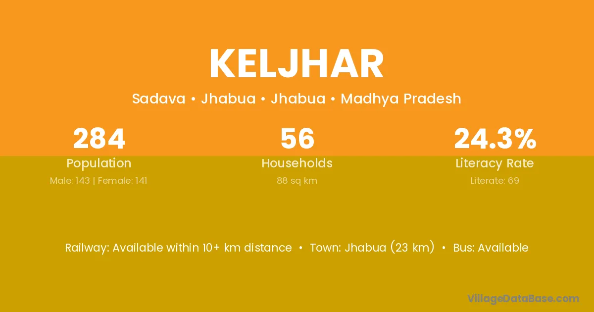 Jhabua (23 km) is the nearest town to Keljhar village for major economic activities and is located approximately 23 km away.