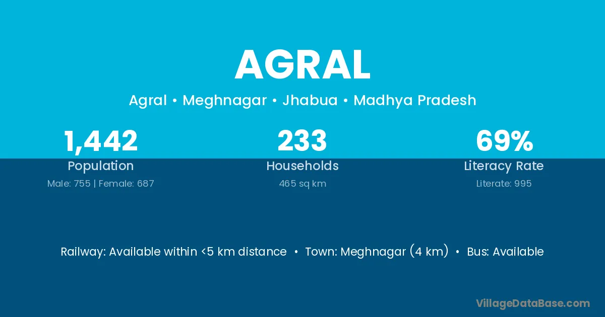 Meghnagar (4 km) is the nearest town to Agral village for major economic activities and is located approximately 4 km away.