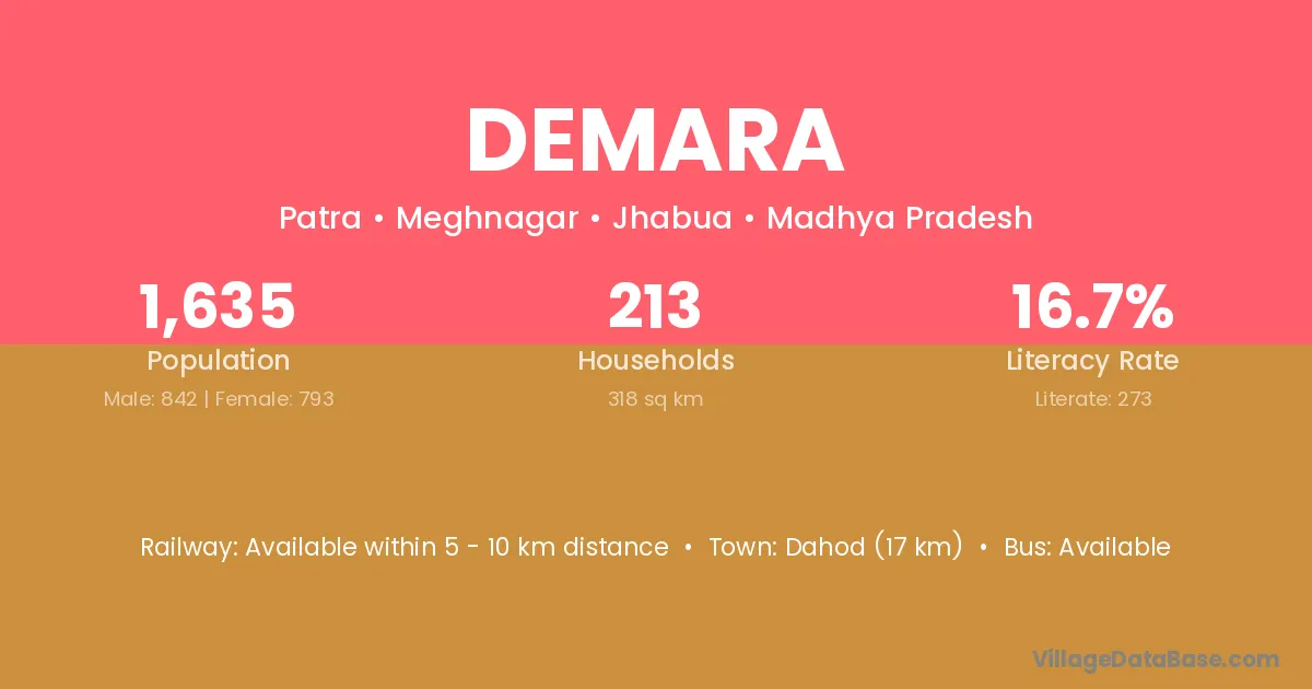 Dahod (17 km) is the nearest town to Demara village for major economic activities and is located approximately 17 km away.