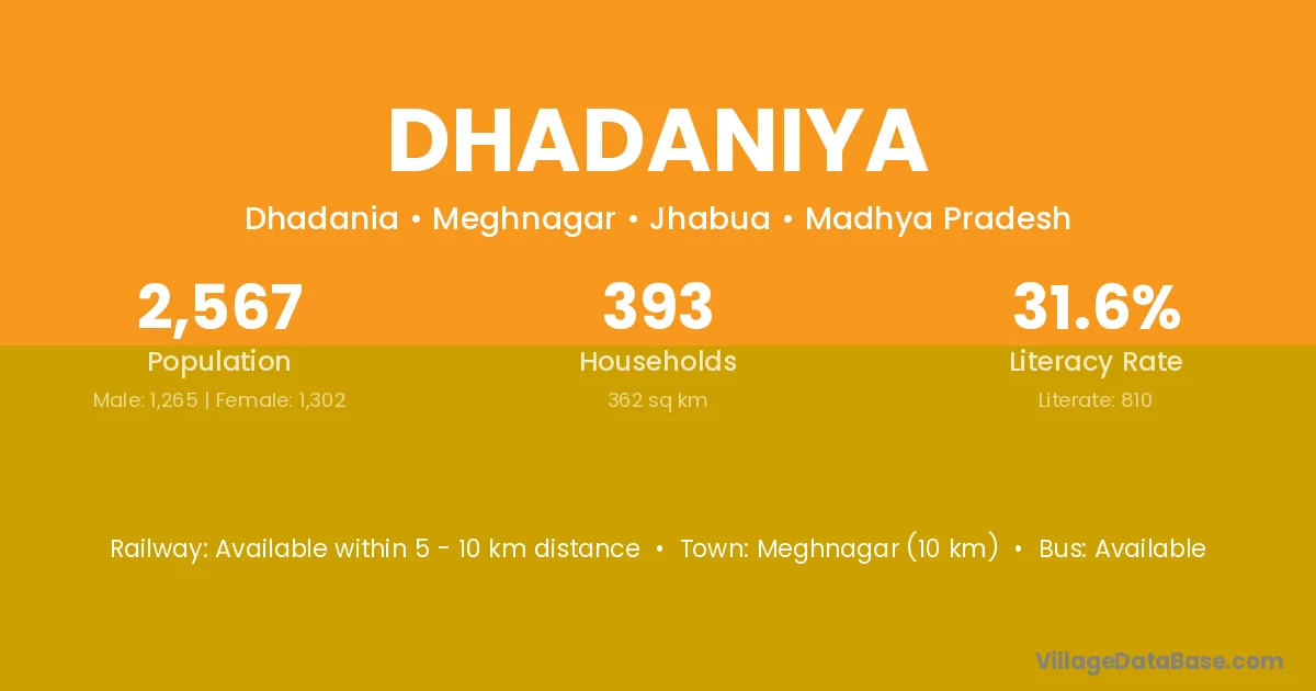 Meghnagar (10 km) is the nearest town to Dhadaniya village for major economic activities and is located approximately 10 km away.