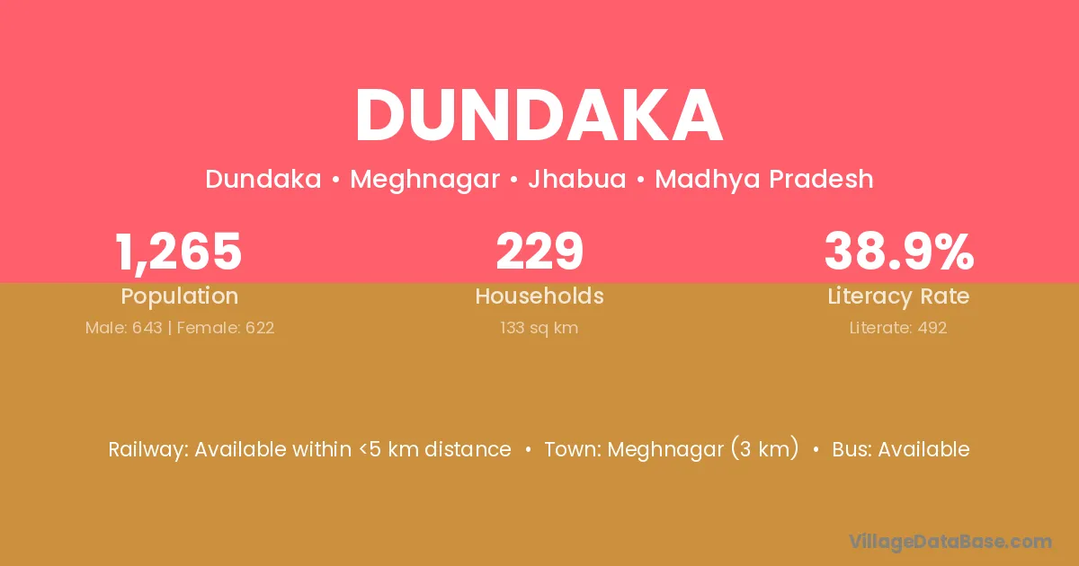 Meghnagar (3 km) is the nearest town to Dundaka village for major economic activities and is located approximately 3 km away.