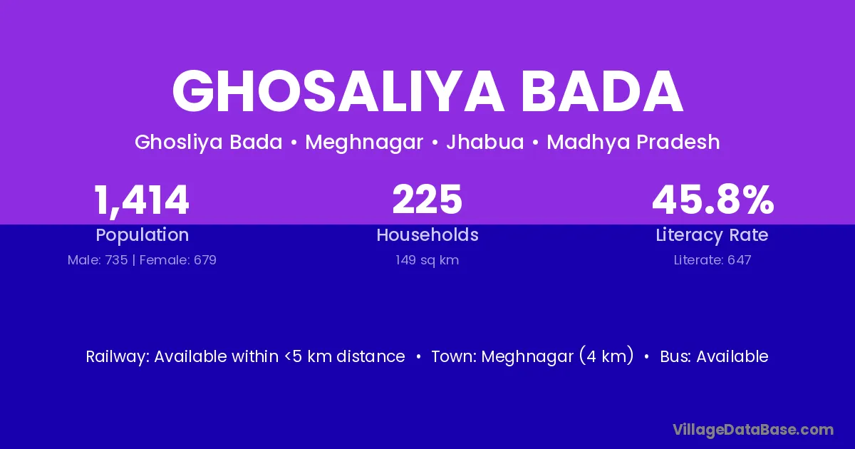 Meghnagar (4 km) is the nearest town to Ghosaliya Bada village for major economic activities and is located approximately 4 km away.