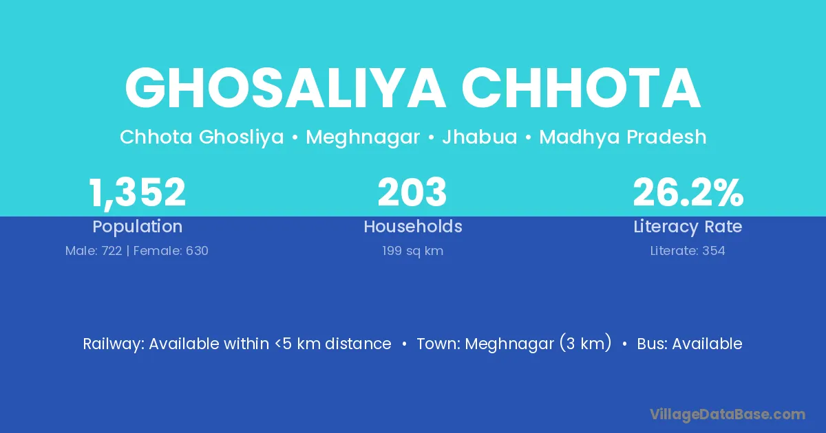Meghnagar (3 km) is the nearest town to Ghosaliya Chhota village for major economic activities and is located approximately 3 km away.