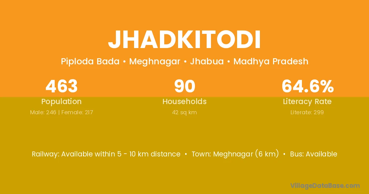 Meghnagar (6 km) is the nearest town to Jhadkitodi village for major economic activities and is located approximately 6 km away.