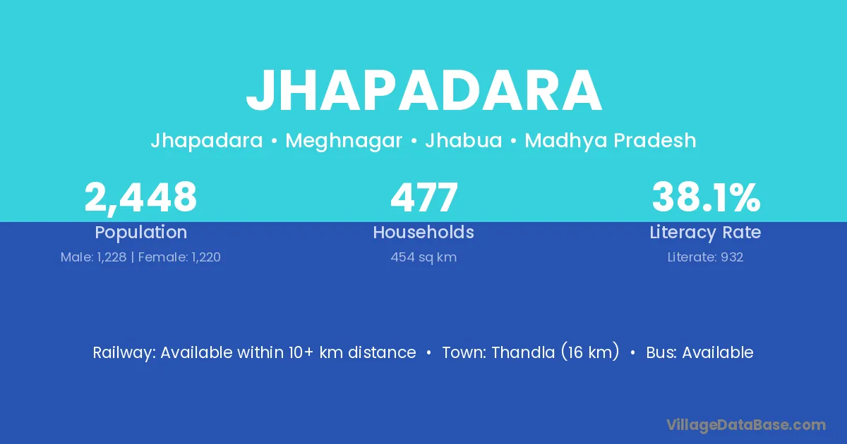 Thandla (16 km) is the nearest town to Jhapadara village for major economic activities and is located approximately 16 km away.