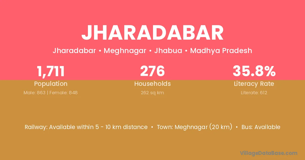 Meghnagar (20 km) is the nearest town to Jharadabar village for major economic activities and is located approximately 20 km away.