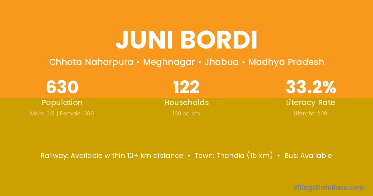 Thandla (15 km) is the nearest town to Juni Bordi village for major economic activities and is located approximately 15 km away.