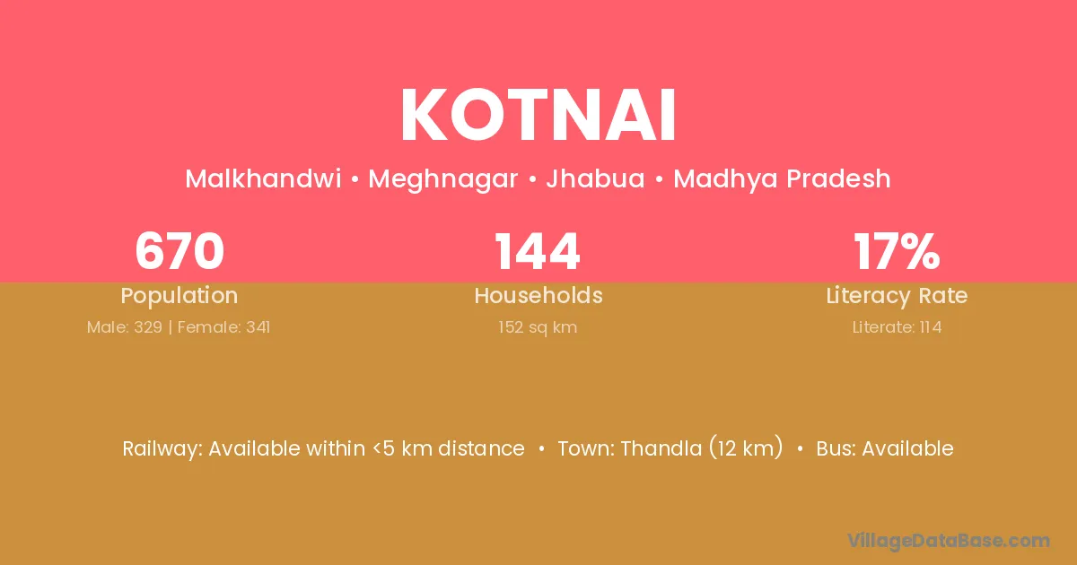 Thandla (12 km) is the nearest town to Kotnai village for major economic activities and is located approximately 12 km away.