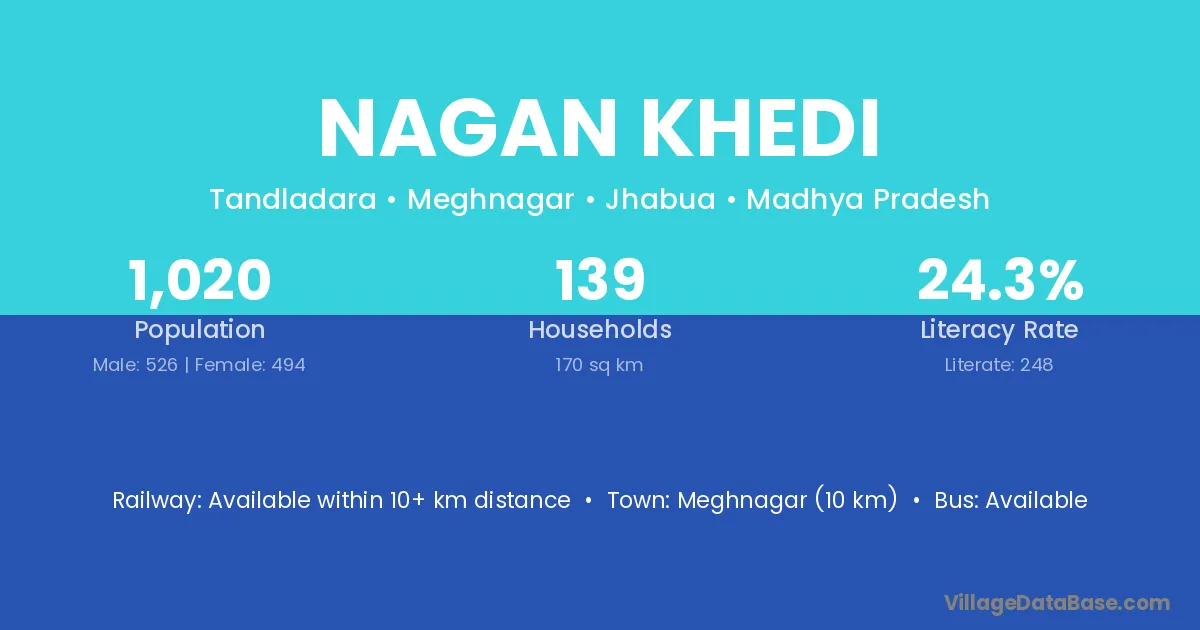 Meghnagar (10 km) is the nearest town to Nagan Khedi village for major economic activities and is located approximately 10 km away.