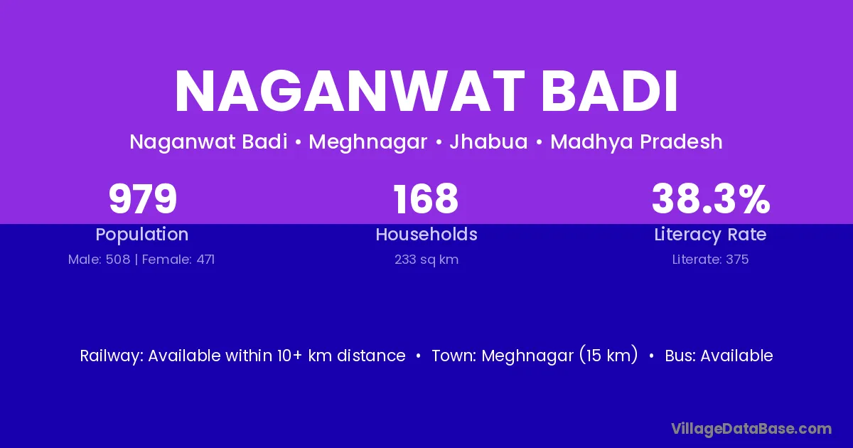 Meghnagar (15 km) is the nearest town to Naganwat Badi village for major economic activities and is located approximately 15 km away.