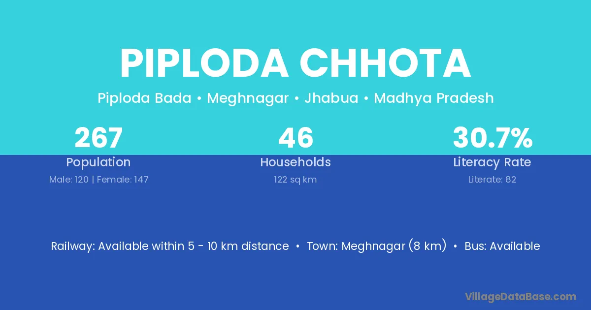 Meghnagar (8 km) is the nearest town to Piploda Chhota village for major economic activities and is located approximately 8 km away.
