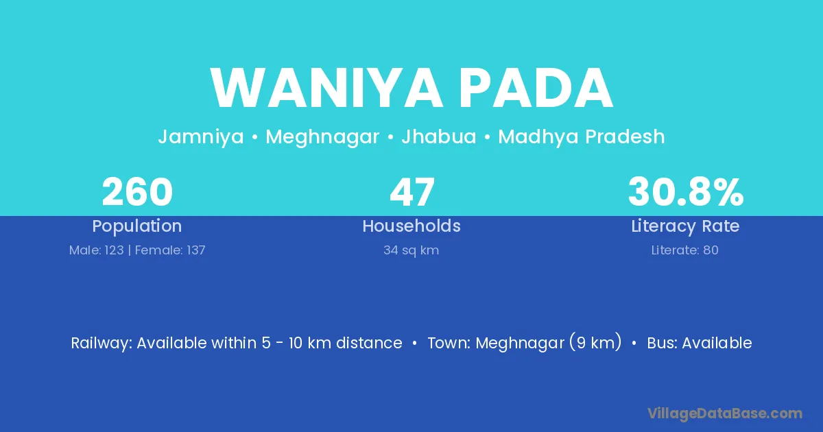 Meghnagar (9 km) is the nearest town to Waniya Pada village for major economic activities and is located approximately 9 km away.