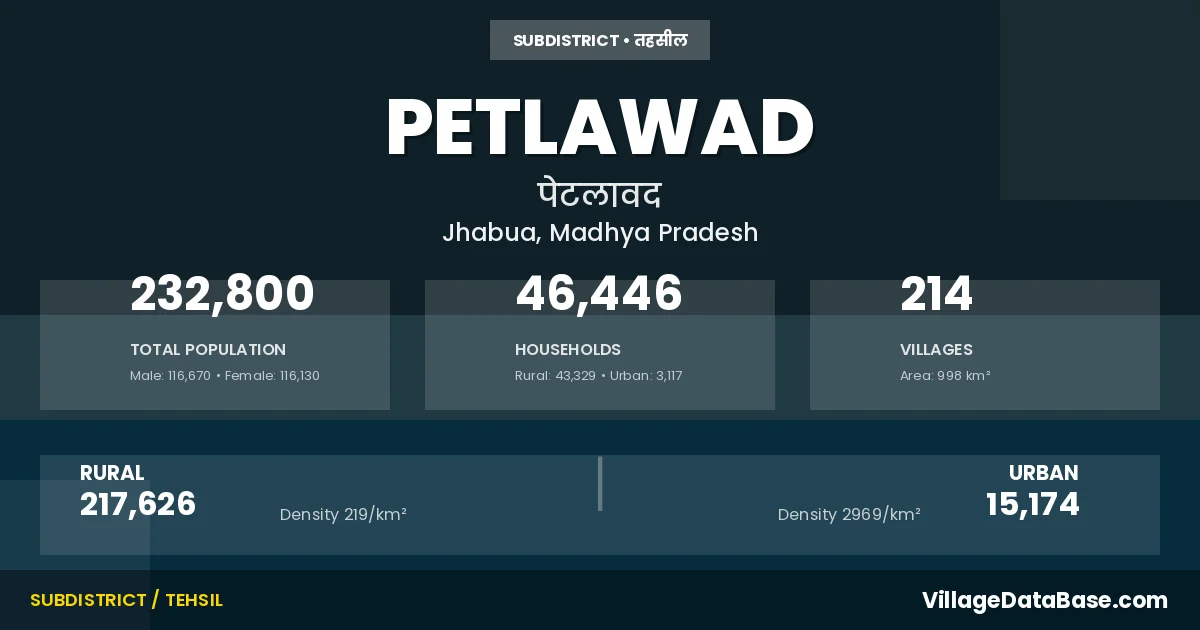 According to the 2011 census The total area of Petlawad Tehsil is 998 km², with a population of 232800 people. The population density is 233 inhabitants per square kilometre, and there are approximately 46446 houses in the sub district.