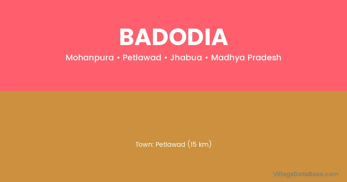 Petlawad (15 km) is the nearest town to Badodia village for major economic activities and is located approximately 15 km away.