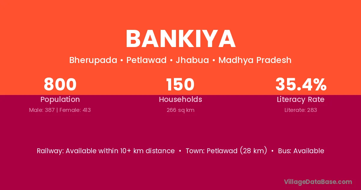 Petlawad (28 km) is the nearest town to Bankiya village for major economic activities and is located approximately 28 km away.