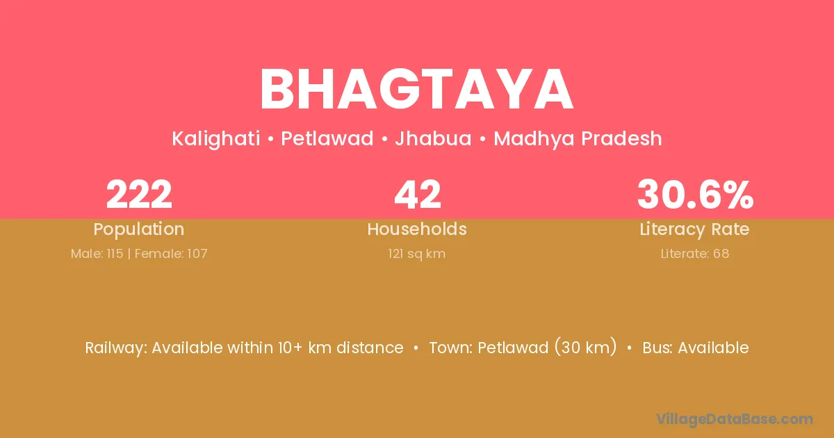 Petlawad (30 km) is the nearest town to Bhagtaya village for major economic activities and is located approximately 30 km away.