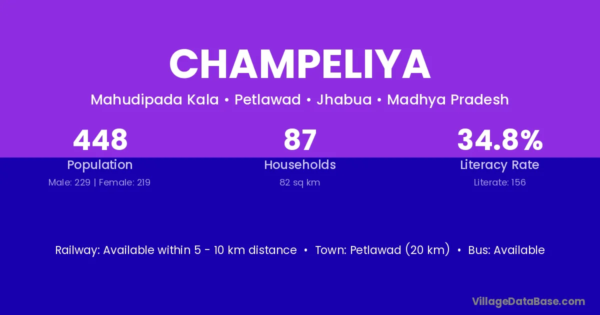 Petlawad (20 km) is the nearest town to Champeliya village for major economic activities and is located approximately 20 km away.