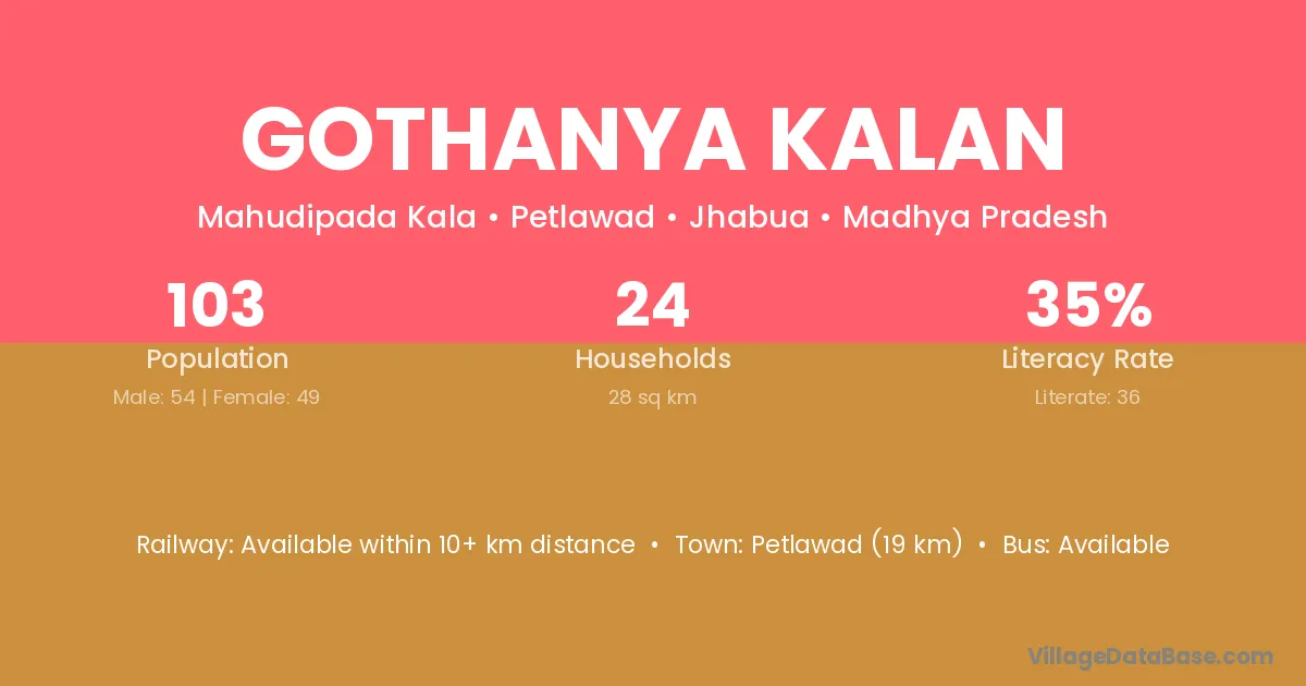 Petlawad (19 km) is the nearest town to Gothanya Kalan village for major economic activities and is located approximately 19 km away.